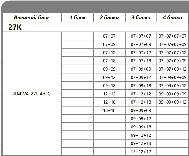 Рассчитан на подключение 4 внутренних блоков. Общая площадь охлаждения до 80 кв.м, комбинации внутренних блоков подбираются индивидуально. Внутренние блоки можно подобрать здесь.