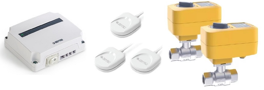 Система защиты от протечки воды Neptun Profi Base 3/4 с проводными датчиками и кранами на 220 вольт. Датчики обнаружения воды устанавливаются в месте ее возможного появления. При срабатывании датчик подает сигнал на модуль с обозначением места протечки, а модуль перекрывает подачу воды с помощью кранов с электроприводом.