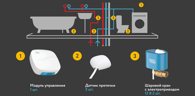 • Полный комплект для защиты. В коробке есть всё необходимое: модуль управления, 2 крана с приводом 12В, 3 датчика протечки с соединительными кабелями и терминатор для контроля линии.