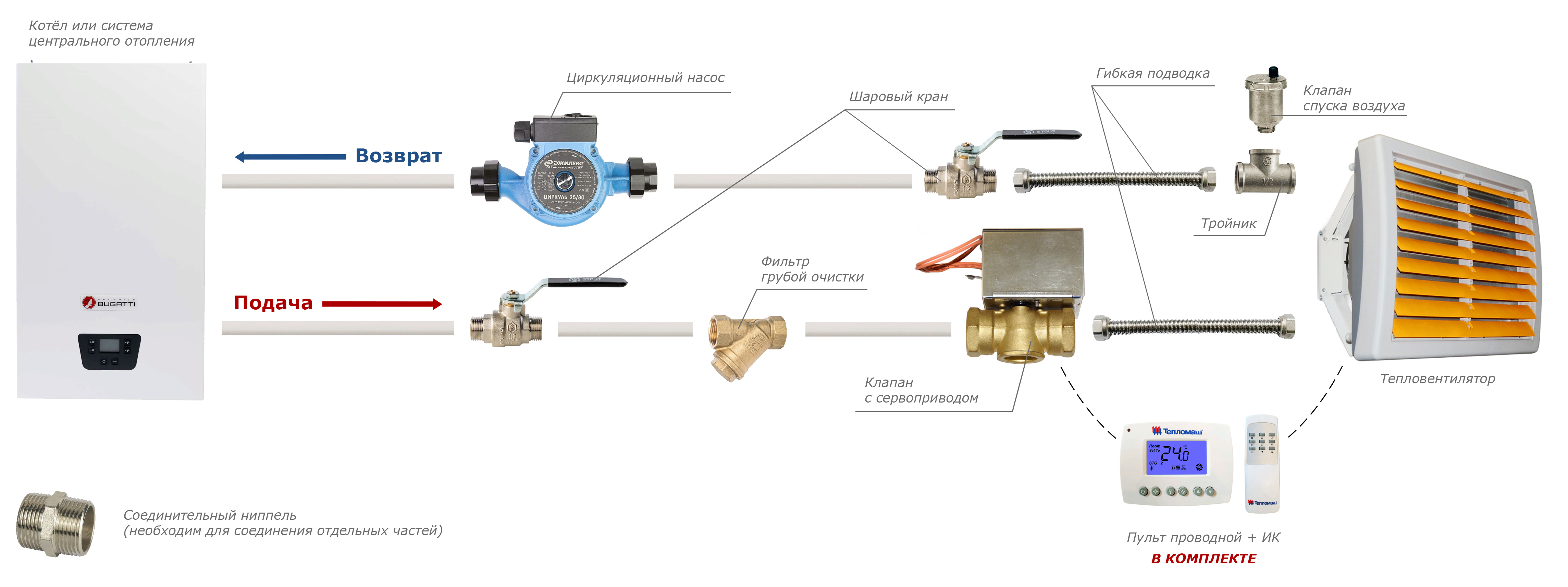 • Стандартная комплектация: тепловентилятор + проводной пульт HL10 с электронным термостатом — поддержание заданной температуры осуществляется за счет включения/выключения вентилятора и его работы на выбранной скорости. При достижении необходимого уровня температуры вентилятор отключается, теплоноситель продолжает циркулировать.