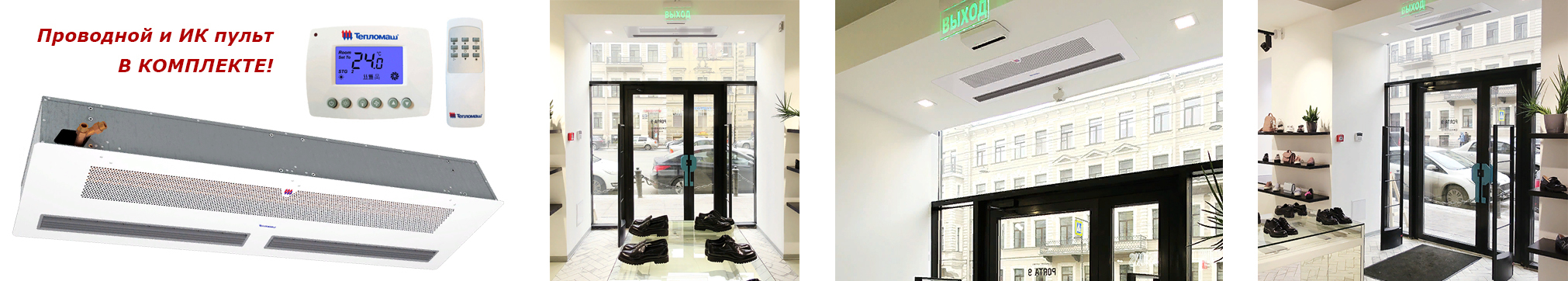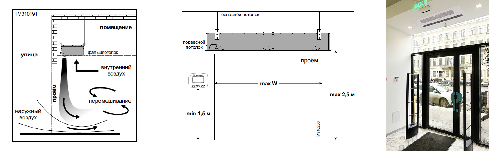 Тепловая завеса смесительного типа, предназначена для защиты помещений от прямого контакта с наружным воздухом через открытые двери в холодный период времени. Встраивается в подвесной или фальш-потолок над дверным проёмом, на высоте не более 2,5 м. Подходит для установки в кафе, торговых павильонах, салонах красоты, гостиницах, медицинских центрах и др.