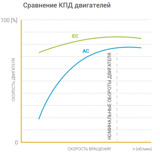 - Основным преимуществом является электродвигатель ЕС с высокой энергоэффективностью, потребление электричества на 40% меньше аналогов.