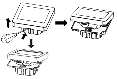 1. С помощью отвертки снимите лицевую крышку терморегулятора, вставив отвертку в нижнюю щель