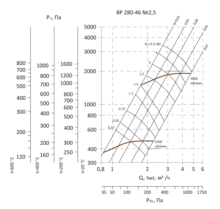Радиальный вентилятор среднего давления ВР 280-46 / №2,5 / 0,37 кВт / 1500 об./мин. / Прав / 0°